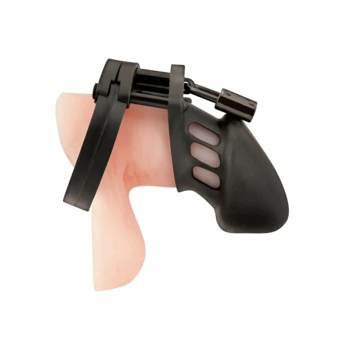 The Silicone Chastity Cage Device provides great comfort and security. The rings consist of three locking pieces that fit perfectly together. The two guide pins hold the top pieces together. The oval locking pin goes through the middle-recessed hole connecting the cage portion to the ring. Assorted size rings and spacers included in each package allow you to fit it to your anatomy. Flexible design ideal for long-term wear with ventilated part for comfort. Curved, ergonomic design that Includes padlock and key