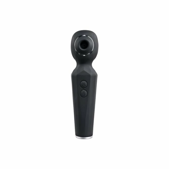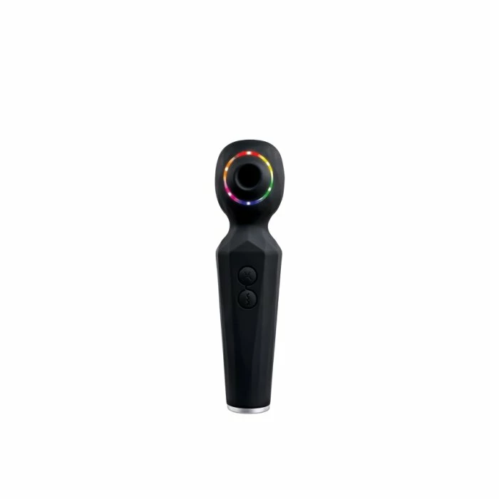 Looking to add a unique pleasure combination to your pleasure arsenal? Look no further then with this dual function wand that vibrates powerfully and sucks gently. The two motors can be independently operated and provide 8 speeds of strong wand vibration and 5 speeds of sensual suction. And remember, these functions can run together or separately depending on your desire. The textured handle makes it easy to hold, and the easy to use 2-button control panel lets your hand relax so you can focus on the good sensations that send will send you right over the edge! Rechargeable, splashproof and easy to clean. Enjoy a light show while you play. The Blue, red & green lights blink in a circle around the suction mouth when in use