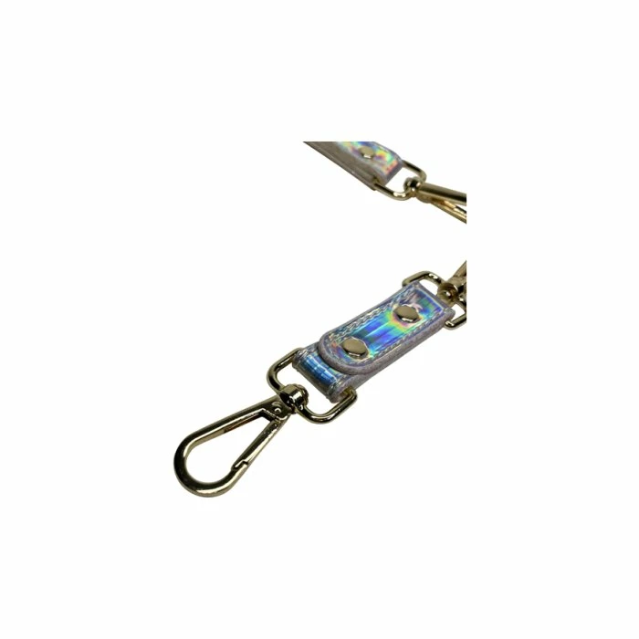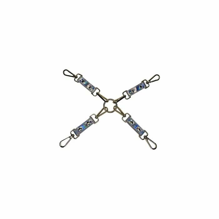 Want to add some shimmer to your play? Vegan Leather hogtie will help restrain your favorite cuffs into fun new predicaments. A new sparkly twist for your kinky adventures. Grow or complete your collection with essentials that are easy to clean, made of vegan leather, and provide new experiences for your desires. This vegan leather hogtie has 4 leash-style, sturdy metal clips which easily attach to restraints. It’s ideal for hogtying or binding ankles to wrists, or whatever else your kinky mind can come up with! Each tie has a clasp on either end, so all parts are removable from the center ring. You can also use it as four separate single-cuff connectors. So the only limit is your imagination.