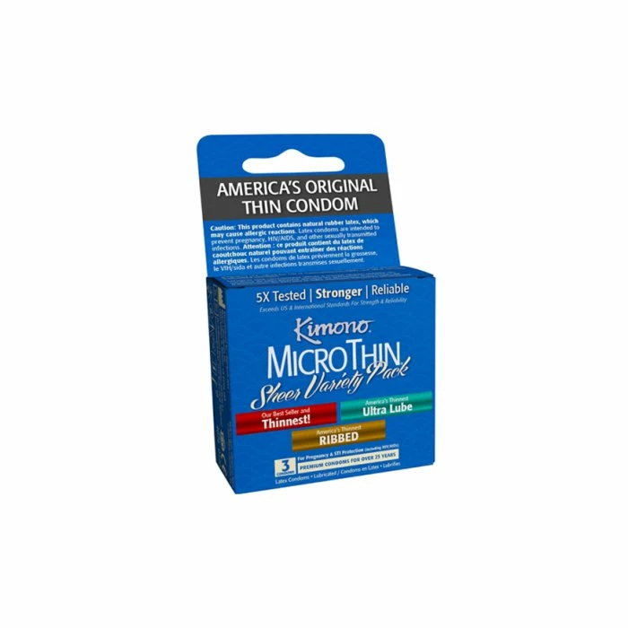 Enjoy a peace of mind without giving up that close feel by using Kimono Mircothin condoms. These condoms are up to 45% thinner than other brands, giving you the protection and feel you want. Kimono MicroThin Ultra Thin provides the most natural experience; couples say it feels like wearing nothing at all. One each of three popular microthin condoms: Thinnest, Ultra Lube, and Ribbed.