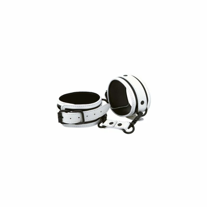 A new twist for your fetish adventures with GLO in the dark restraints gear. Grow or complete your collection with BDSM essentials that are easy to clean, made of vegan leather, and deliver new experiences for your kinky desires. Tie, spank, and GLO from NS Novelties. This set of two adjustable ankle cuffs come also with a connector. Just expose product to light then you can enjoy it even more when the lights go out and the glow begins.